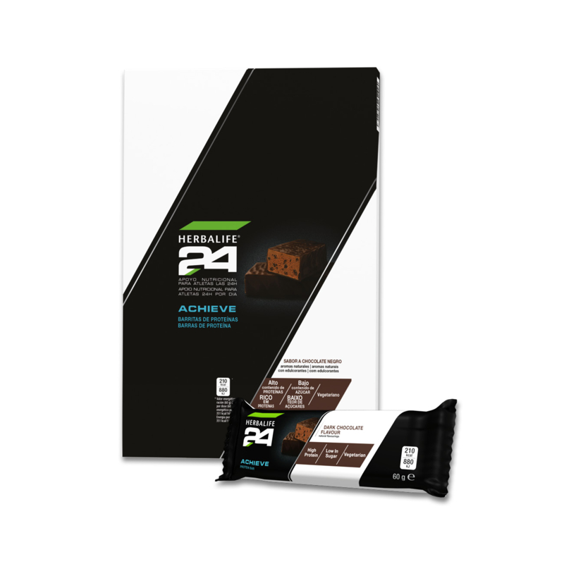 Mantenha o seu estilo de vida ativo e saudável e delicie-se com o rico sabor a "Chocolate Negro" ou "Biscoito com Pedacinhos de Chocolate" das Barras de Proteína Achieve H24.
